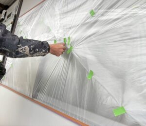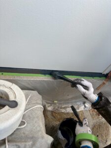 窓など、付帯部の養生から確実に行うことがプロとしての心掛け。