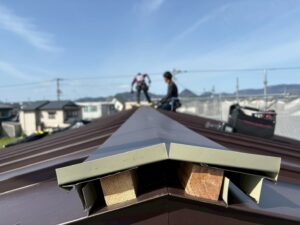 写真の段階では棟板金の端部が立ちあがっていますが、これは現場にて折り曲げて、現場に即した確実な加工を行います。